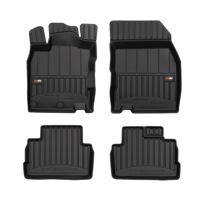 Guminiai ProLine 3D kilimėliai: (aukštos kokybės plastiko, gumos mišinys / TPE, komplektas - 4vnt., juodi, krašto aukštis 7 cm, montavimo būdas - spaustukai). AUTOMOBILIŲ KILIMĖLIAI FROGUM 3D PROLINE LUXURY • Dėl naujoviškos 3D skenavimo technologijos atitinka idealiai; • Kraštai papildomai apsaugoti – aukštis 7 cm, visada švarus automobilis; • Itin patvari medžiaga su unikalia neslystančia struktūra, atspari nešvarumams. • Išskirtinis stabilumas dėl spaustukų – lengvai montuojama spustelėjus; • Pakojo zonos apsauga – komfortas, leidžiantis nuleisti vairuotojo koją; 3D ProLine aukštos kokybės guminiai kilimėliai padeda išlaikyti automobilį švarų. Modernus ir funkcionalus dizainas, ir ypač aukštas kraštas garantuoja efektyvų vandens ir purvo surinkimą ir neleidžia jiems išbėgti. Taip automobilio salonas išlieka švarus. Pagaminti iš aukštos kokybės gumos, kurioje nėra toksiškų komponentų. Bekvapis. Kilimėliai idealiai atitinka ir puikiai priglunda prie salono grindų. Guminiai kilimėliai išlaiko savo elastingumą net esant temperatūros pokyčiams. Specialus paviršius neleidžia kilimėliams slysti vairuojant, o tai daro didelę įtaką saugumui ir kelionės patogumui