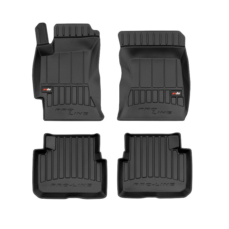 Guminiai ProLine 3D kilimėliai: (aukštos kokybės plastiko, gumos mišinys / TPE, komplektas - 3vnt., juodi, krašto aukštis 7 cm, montavimo būdas - spaustukai). AUTOMOBILIŲ KILIMĖLIAI FROGUM 3D PROLINE LUXURY • Dėl naujoviškos 3D skenavimo technologijos atitinka idealiai; • Kraštai papildomai apsaugoti – aukštis 7 cm, visada švarus automobilis; • Itin patvari medžiaga su unikalia neslystančia struktūra, atspari nešvarumams. • Išskirtinis stabilumas dėl spaustukų – lengvai montuojama spustelėjus; • Pakojo zonos apsauga – komfortas, leidžiantis nuleisti vairuotojo koją; 3D ProLine aukštos kokybės guminiai kilimėliai padeda išlaikyti automobilį švarų. Modernus ir funkcionalus dizainas, ir ypač aukštas kraštas garantuoja efektyvų vandens ir purvo surinkimą ir neleidžia jiems išbėgti. Taip automobilio salonas išlieka švarus. Pagaminti iš aukštos kokybės gumos, kurioje nėra toksiškų komponentų. Bekvapis. Kilimėliai idealiai atitinka ir puikiai priglunda prie salono grindų. Guminiai kilimėliai išlaiko savo elastingumą net esant temperatūros pokyčiams. Specialus paviršius neleidžia kilimėliams slysti vairuojant, o tai daro didelę įtaką saugumui ir kelionės patogumui