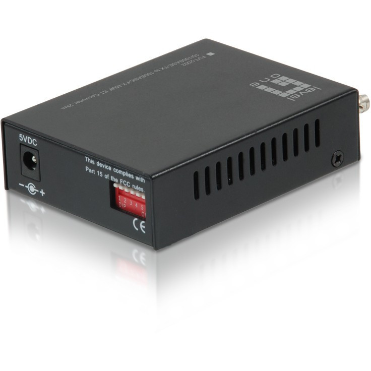 "LevelOne RJ45 to ST Fast Ethernet Media Converter, Multi-Mode Fiber, 2km. Maximum data transfer rate: 100 Mbit/s, Converter input interface: 10Base-T, 100Base-TX, Converter output interface: 100Base-FX. Maximum transfer distance: 2000 m, Wavelength: 1310 nm, Fiber cable diameters supported (core/cladding): 50/125,62.5/125 µm. LED indicators: Activity, Link, Product colour: Black. Fiber optic connector: ST, Connectivity technology: Wired. Input voltage: 5 V, Input current: 1 A"\n"The FVT-2002 MMF ST media converter is able to convert network signals between copper and fiber-optic based networks. The converter provides a 10/100Base-TX RJ-45 port, supports full duplex and half duplex switch connectivity and 10Base-T and 100Base-TX auto-sensing. Used in multi-mode with fibre-optic cabling, this can extend a network range up to 2 km.