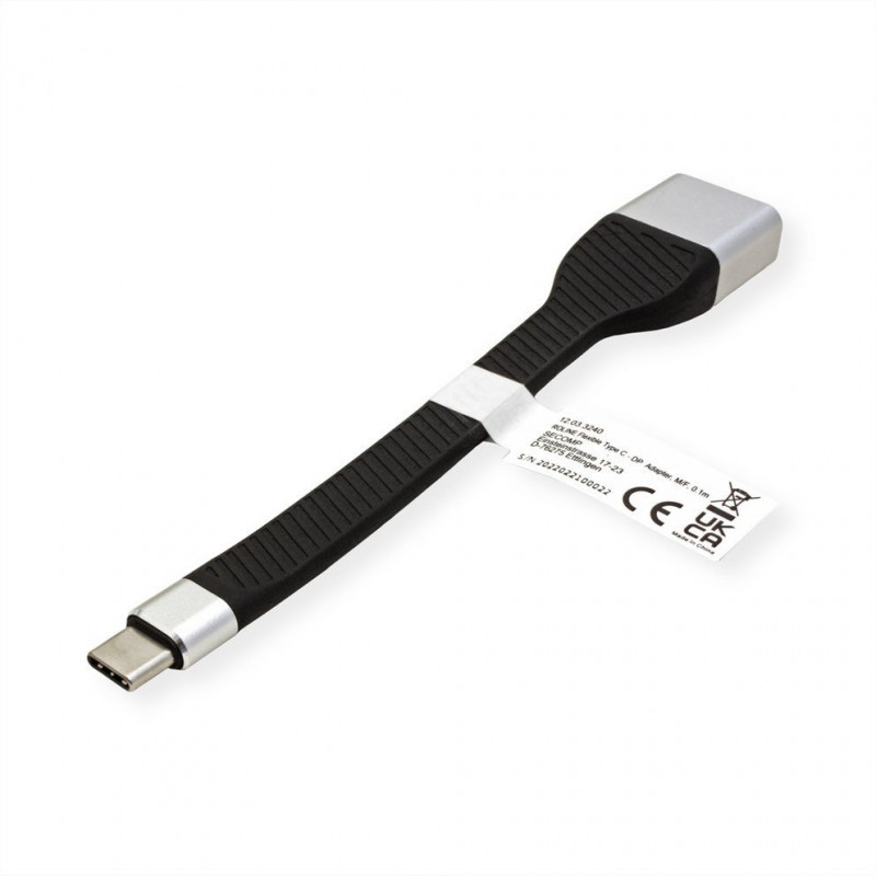 "ROLINE 12033240. Cable length: 0.13 m, Connector 1: USB Type-C, Connector 2: DisplayPort. Weight: 16.2 g. Package width: 100 mm, Package depth: 100 mm, Package height: 20 mm"\n