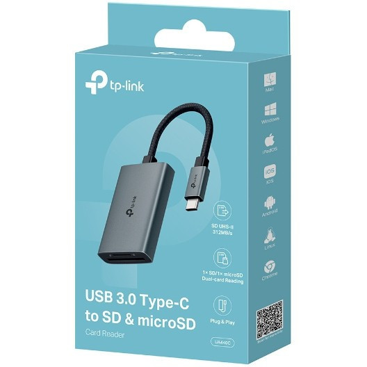 "TP-Link UA440C. Compatible memory cards: MicroSD (TransFlash), SD, Product colour: Grey, Housing material: Aluminium. Interface: USB 3.2 Gen 1 (3.1 Gen 1) Type-C. Width: 544 mm, Depth: 342 mm, Height: 115 mm"\n"Simultaneously Read/Write Dual UHS-II Cards