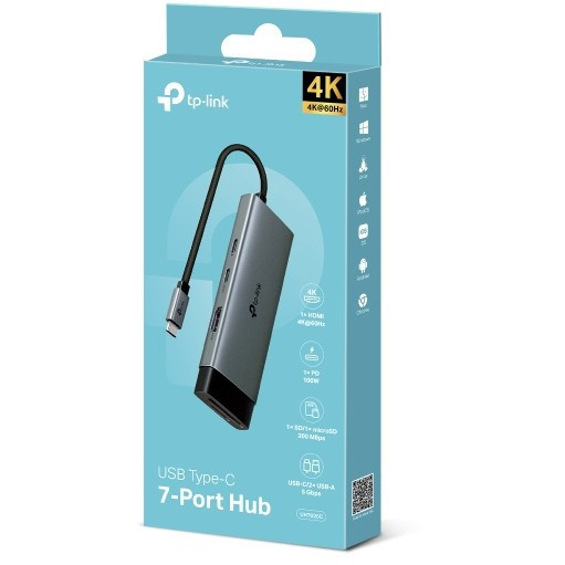 "TP-Link UH7020C. Host interface: USB 3.2 Gen 1 (3.1 Gen 1) Type-C, Hub interfaces: HDMI, USB 3.2 Gen 1 (3.1 Gen 1) Type-A, USB 3.2 Gen 1 (3.1 Gen 1) Type-C, Compatible memory cards: MicroSD (TransFlash), SD. Data transfer rate: 5000 Mbit/s, Certification: CE, FCC, RoHS, HDMI, BSMI. Width: 127 mm, Depth: 40 mm, Height: 12.2 mm"\n"Compact and Elegant Design