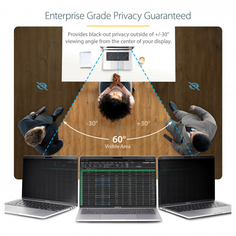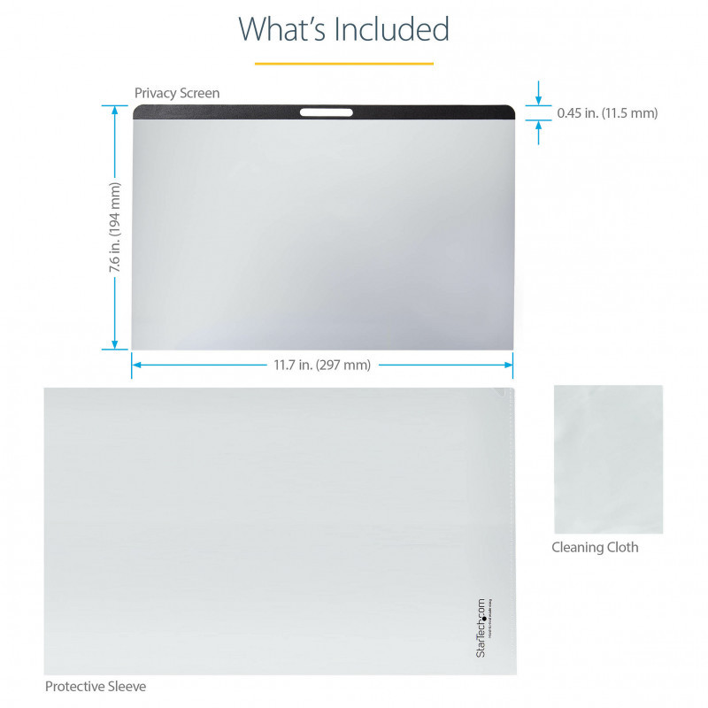 "StarTech.com Laptop Privacy Screen for 13 inch MacBook Pro & MacBook Air - Magnetic Removable Security Filter - Blue Light Reducing Screen Protector 16:10 - Matte/Glossy - +/-30 Degree. Maximum screen size: 33 cm (13""). Aspect ratio: 16:10. Suitable for: Laptop. Protection features: Scratch-resistant, Limits viewing angle: 30°. Weight: 37 g"\n"Laptop Privacy Filter | Blue Light Reduction | Matte or Glossy | 2-Year Warranty