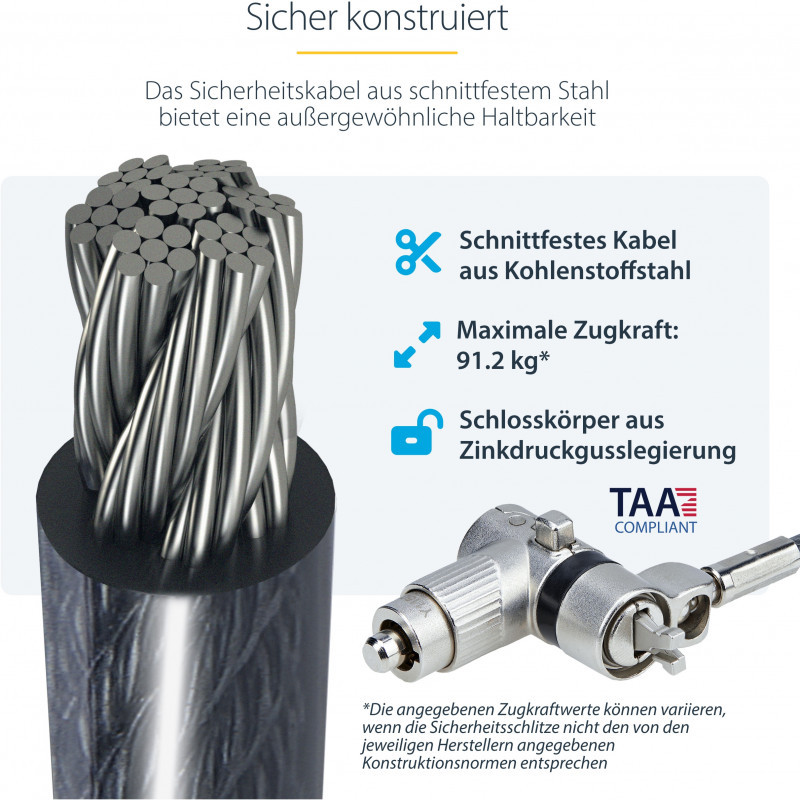 "StarTech.com 25-Pack Universal Laptop Lock 6.6ft, Keyed Alike Locking Cable, Security Cable, Compatible w/Noble Wedge®/Nano/K-Slot, Anti-Theft Cut-Resistant Cable. Product colour: Black, Best uses: Laptop, Lock type: Key. Cable length: 2 m, Cable diameter: 4.4 mm, Weight: 125 g. Quantity per pack: 25 pc(s), Package width: 333 mm, Package depth: 258 mm. Master (outer) case width: 348 mm, Master (outer) case length: 273 mm, Master (outer) case height: 279 mm"\n"Secure a laptop, docking station, or other peripherals with this 3-in-1 keyed alike cable lock