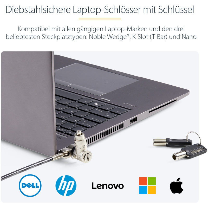 A unique on-the-fly lock tip mechanism allows to quickly adapt the lock tip to different security slots. Simply rotate the lock selection dial to change the shape of the lock tip to match the security slot, all without the need to carry different lock tips or use special tools. The cut-resistant steel security cable is 6.6ft (2m) long and 0.17in (4.4mm) thick, providing reach and durability.