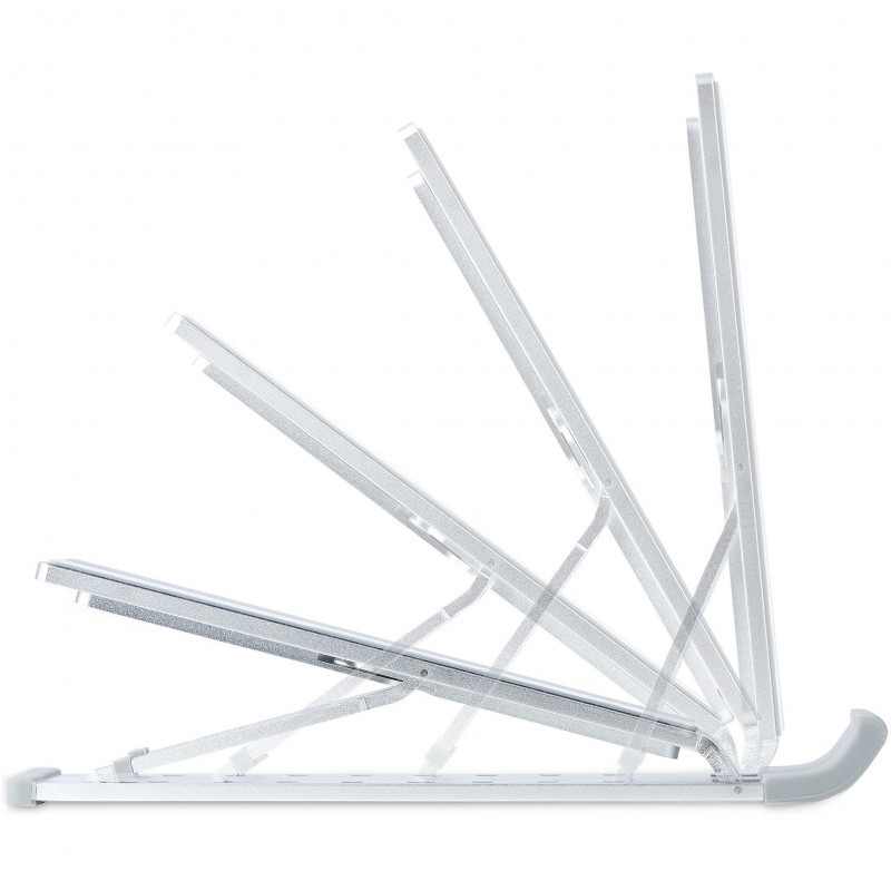 The ergonomic laptop stand features 9 different angle adjustments (15° / 27° / 37° / 45° / 52° / 60° / 67° / 75° / 84°) to help find the most comfortable viewing angle. The raised lip at the front and the anti-slip rubber pads prevent the laptop from shifting while making adjustments and during operation. In addition, the pads protect the mounted device from cosmetic damage.