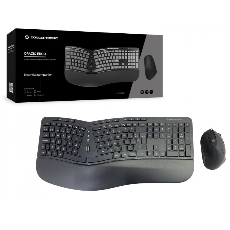 "Conceptronic ORAZIO ERGO Wireless Ergonomic Keyboard & Mouse Kit, Spanish layout. Keyboard form factor: Full-size (100%). Keyboard style: Curved. Connectivity technology: Wireless, Device interface: RF Wireless, Keyboard layout: QWERTY, Keyboard number of keys: 125. Wrist rest. Recommended usage: Office. Product colour: Black. Mouse included"\n"This wireless ergonomic keyboard and mouse combination is an essential companion for the home or office. Simply plug and play to get easy, seamless performance from your devices. The ergonomic keyboard features a full suite of 125 soft-touch keys for accurate, comfortable typing. Comes with a built-in scroll wheel, for easy web browsing and fast, efficient use of software and applications.