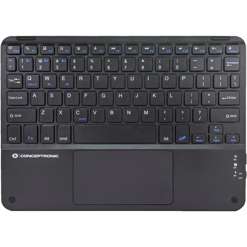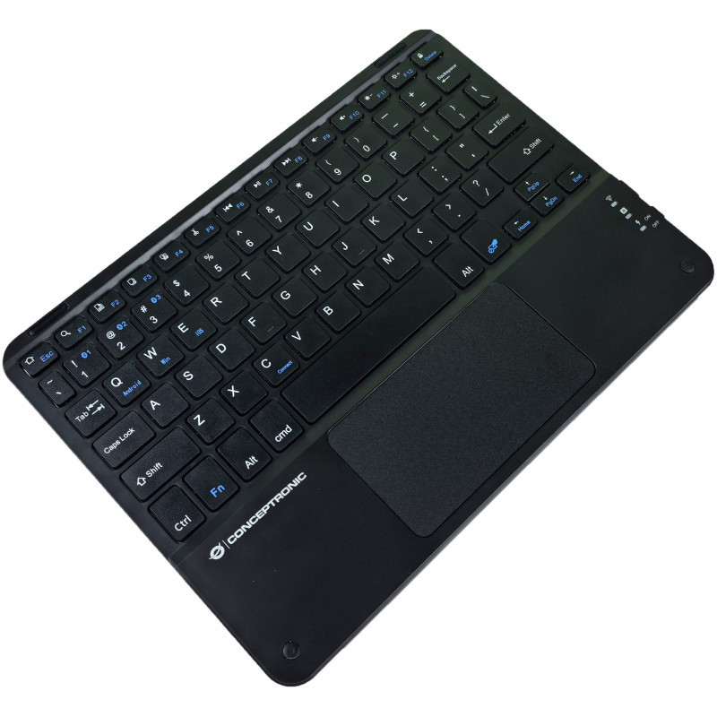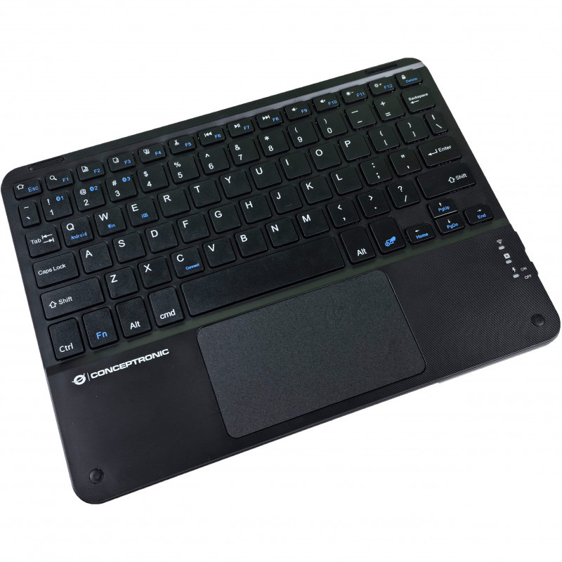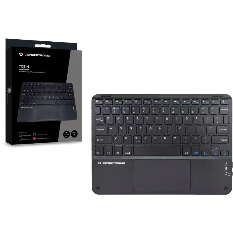"Conceptronic TOBIN01BUS 10-inch Bluetooth Touchpad Keyboard, QWERTY EN (US). Keyboard form factor: Tenkeyless (80 - 87%). Keyboard style: Straight. Connectivity technology: Wireless, Device interface: Bluetooth, Keyboard layout: QWERTY, Recommended usage: Universal. Product colour: Black"\n"The 10-inch Bluetooth Touchpad Keyboard is designed for ultimate convenience and versatility. Featuring Bluetooth 5.4 wireless connectivity for a stable and efficient connection, it allows you to connect up to three devices and switch between them with ease. Its rechargeable battery eliminates the hassle of constant replacements. Enjoy a comfortable typing experience combined with precise touch control for all your tasks."