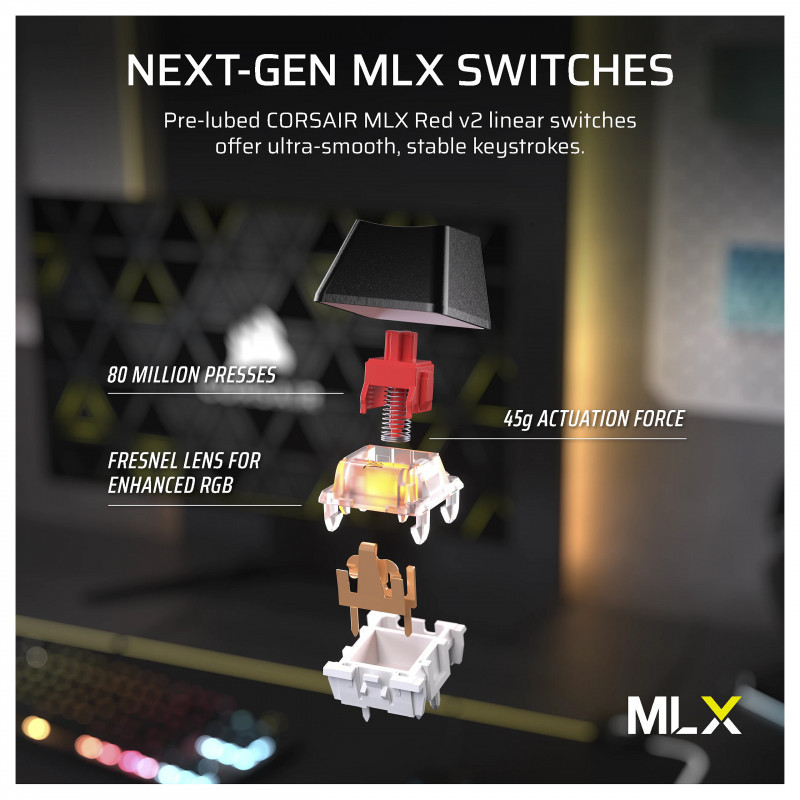 CORSAIR MLX Red v2 linear switches are pre-lubed, so you can enjoy buttery smooth keystrokes.
