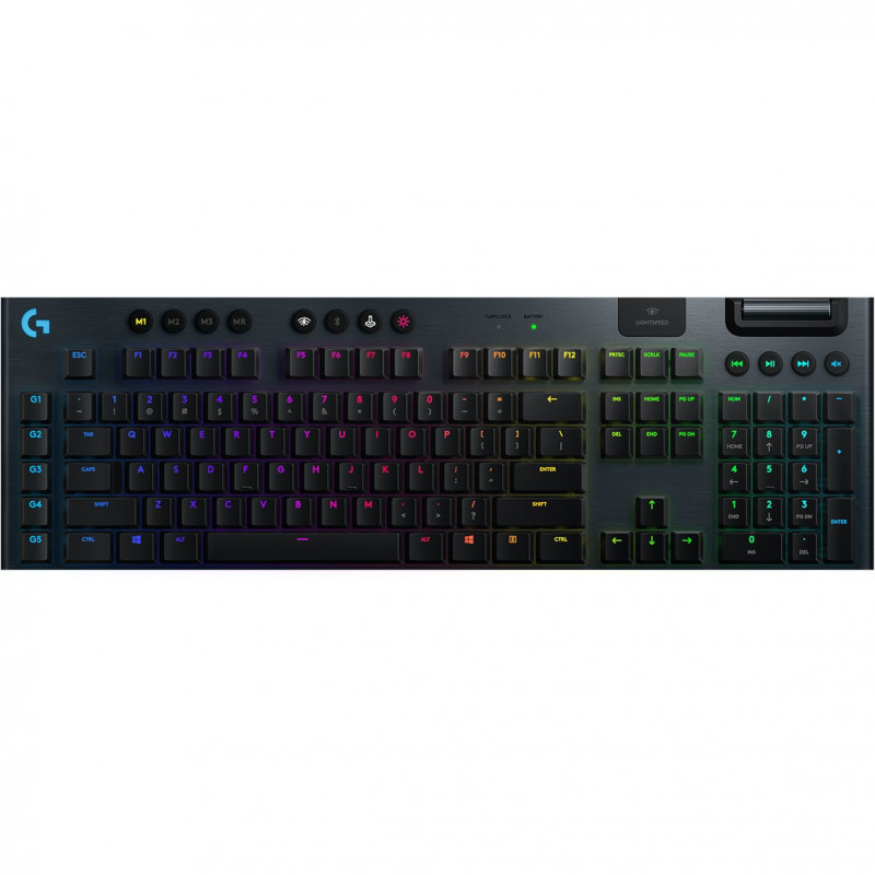 "Logitech G G915 LIGHTSPEED – GL Linear. Keyboard form factor: Full-size (100%). Keyboard style: Straight. Connectivity technology: Wireless, Device interface: RF Wireless + Bluetooth, Keyboard key switch: Mechanical, Keyboard layout: QWERTZ. Cable length: 1.8 m. Recommended usage: Gaming. Product colour: Black"\n