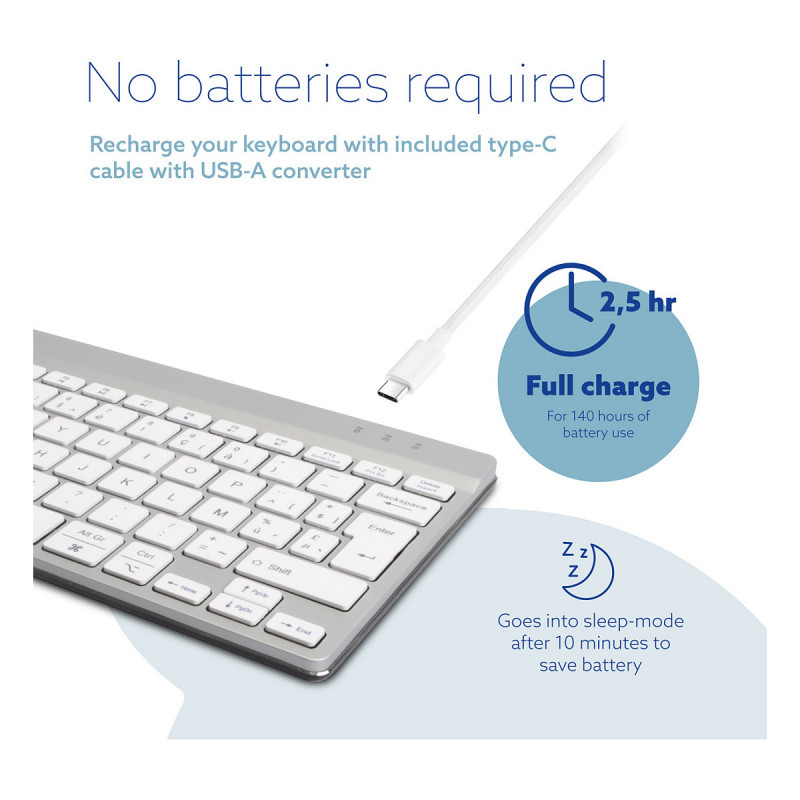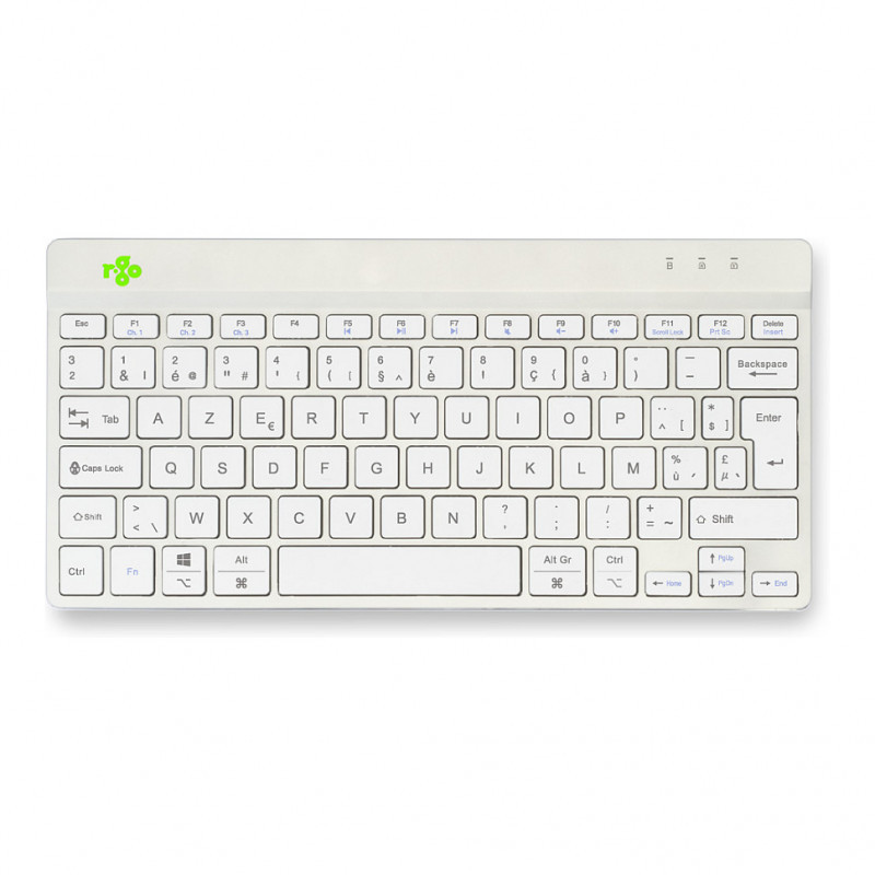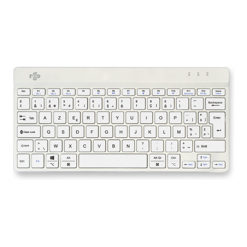 "R-Go Tools Ergonomic keyboard R-Go Compact Break, compact keyboard with break software, AZERTY (BE), Bluetooth, white. Keyboard form factor: Mini, Connectivity technology: Wireless, Device interface: Bluetooth, Keyboard key switch: Scissor key switch, Keyboard layout: AZERTY. Cable length: 1.55 m. USB hub, Recommended usage: Office. Product colour: White"\n"This compact keyboard has all the ergonomic features for healthy typing. The compact design ensures that your hands always remain within shoulder width when using keyboard and mouse simultaneously. The light keystroke reduces muscle tension while typing. The keyboard is ultra thin, so your hands and wrists are in a relaxed, natural position while typing. This ensures better blood flow to your hands. The R-Go Compact Break keyboard indicates with LED colour signals when it is time to take a break. As you type, the light changes colour, like a traffic light. When the light turns green, it means you are working healthily. Orange indicates it is time for a short break and red that you have been working too long. Taking short breaks during your working day will increase your concentration, prevent strain injuries and keep you fit during your working day. This product works together with the R-Go Break Software that won the Benelux Office Products Award 2021."