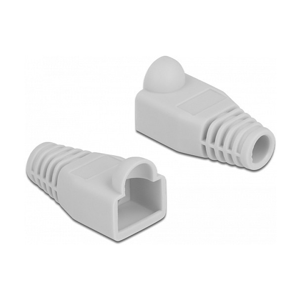 "DeLOCK Strain relief for RJ45 plug grey 20 pieces. Product colour: Grey, Material: Rubber, Quantity per pack: 20 pc(s). Width: 15 mm, Depth: 28 mm, Height: 14 mm. Package type: Polybag"\n"Description