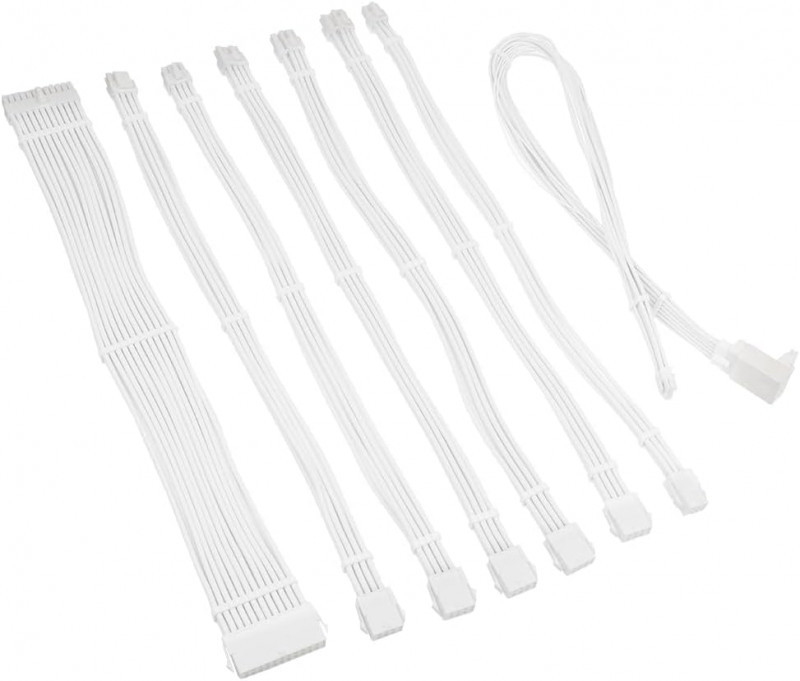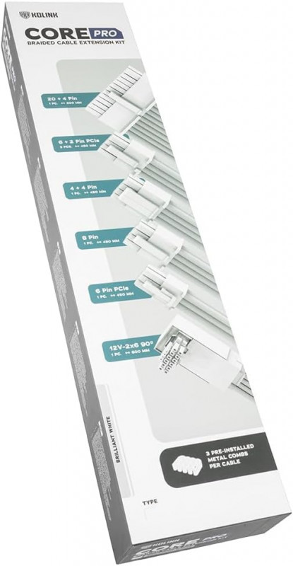Kolink Core Pro Braided Cable Extension Kit 12V-2x6 Type 1 – Jet Black/Brilliant White – tai aukštos kokybės maitinimo kabelių prailginimo rinkinys, skirtas žaidimų kompiuteriams ir kompiuterių entuziastams. Komplekte yra 8 prailginimo kabeliai ir 90° 12V 2x6 adapteris, užtikrinantis suderinamumą su naujausiais maitinimo šaltiniais bei grafikos plokštėmis.