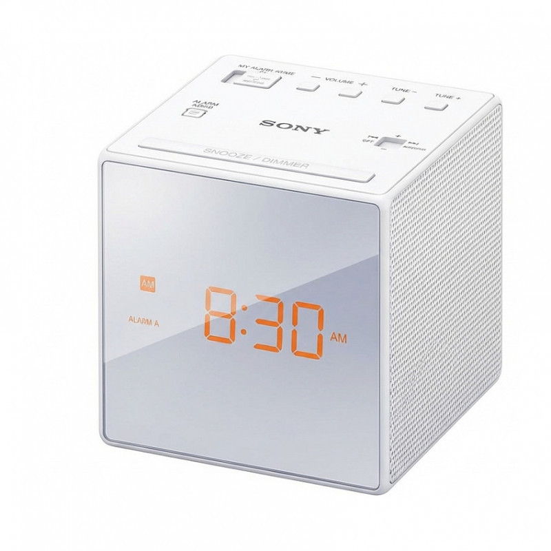 "Sony ICF-C1. Radio type: Clock, Supported radio bands: AM, FM, FM band range: 87.5 - 108 MHz. RMS rated power: 0.1 W. Driver unit: 6.6 cm. Product colour: White, Volume control: Rotary. Battery type: CR2032"\n"Details