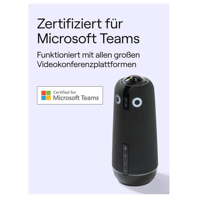 "Owl Labs Meeting Owl 4+ 360-Degree, 4K Smart Video Conference Camera, Microphone and Speaker (Automatic Speaker Focus, Smart Zooming and Noise Equalising). Product type: Group video conferencing system. Sensor type: CMOS. HD type: 4K Ultra HD, Supported video modes: 360p, 720p, 1080p, 1440p, 2160p, Maximum frame rate: 30 fps. Ethernet LAN, Wi-Fi. Product colour: Charcoal"\n"The Meeting Owl 4+ is our next-generation all-in-one camera, speaker, and mic device that combines 4K 360° video with award-winning speaker-switching software and purpose-built enterprise features to power effective hybrid collaboration in any space. The Meeting Owl is certified for Microsoft Teams and compatible with all web-based video conferencing platforms, including Google Meet, Zoom, Slack, GoTo Meeting, and many others. Pair with an Owl Bar or pair two Meeting Owls to expand your coverage, and even add a Whiteboard Owl or Expansion Mic to complete a full-room hybrid setup."