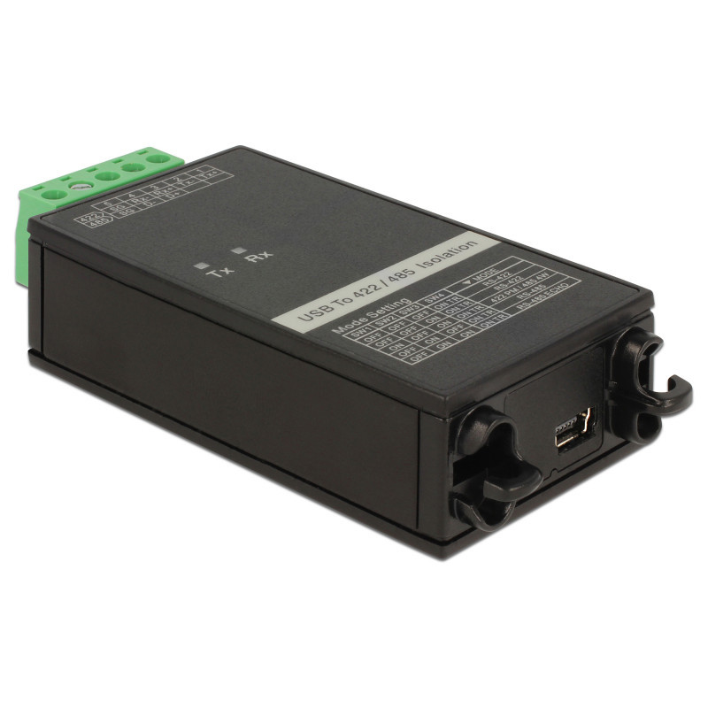 "DeLOCK 62501. Connector 1: USB 2.0, Connector 2: RS-422/485. Product colour: Black, Green"\n"The Delock USB to serial converter enables you to connect a serial device to a free USB port. This USB converter separates the electrical connection between Host-PC and USB device. The galvanic isolation avoids the disturbing noises in the audio field and inexact measuring results in the laboratory field. The compact device supports the USB 2.0 specification with Low- and Full-Speed."