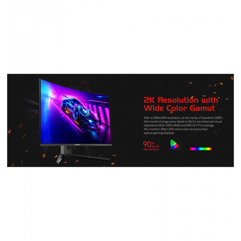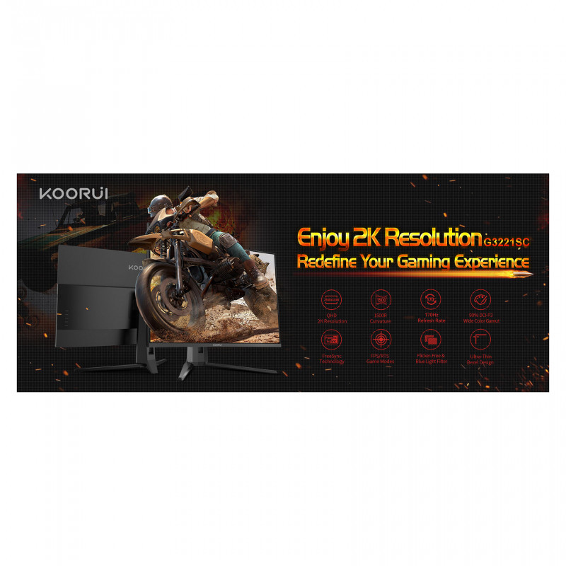 "Koorui G3221SC. Display diagonal: 80 cm (31.5""), Display resolution: 2560 x 1440 pixels, HD type: Quad HD, Response time: 1 ms, Native aspect ratio: 16:9, Viewing angle, horizontal: 178°, Viewing angle, vertical: 178°. VESA mounting. Product colour: Black"\n