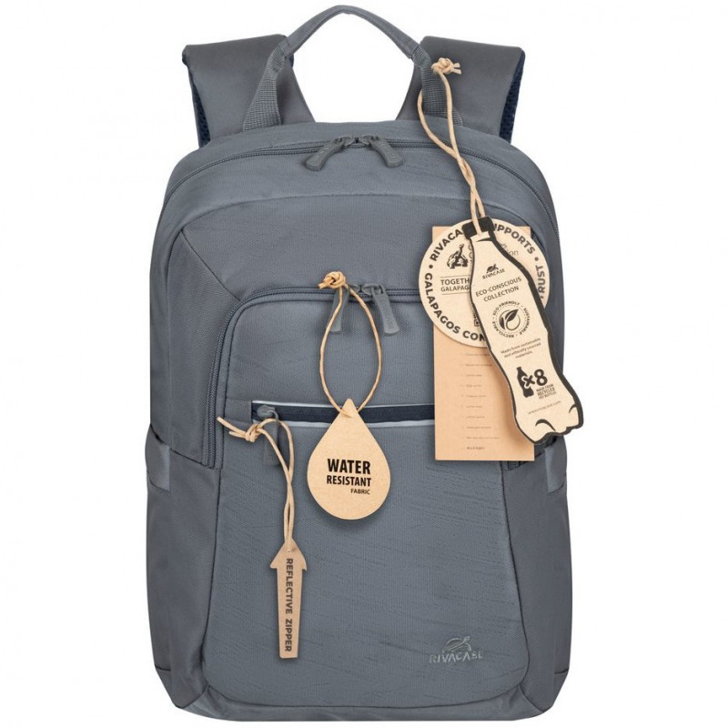 "Rivacase Alpendorf 7523. Backpack type: Casual backpack, Product main colour: Grey, Style: Urban. Sustainability certificates: Global Recycled Standard (GRS). Width: 255 mm, Depth: 130 mm, Height: 400 mm. Material: Polyester, Material details: ECO-FRIENDLY RPET polyester"\n"Manufactured using ECO-FRIENDLY RPET polyester made from multiple used plastic bottles that may have ended up as landfill or in the oceans. The equivalent of 8 × 500ml plastic bottles is used in the production of each backpack. "
