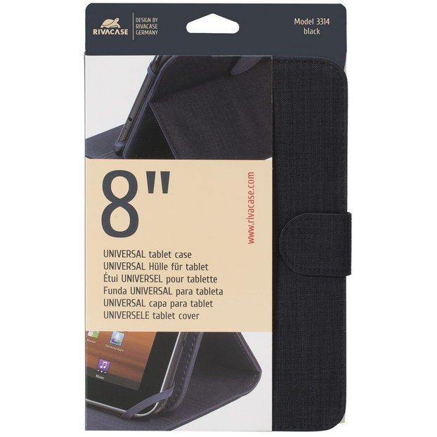 "Rivacase 3314. Case type: Folio, Brand compatibility: Any brand, Compatibility: Apple iPad mini 4 Asus VivoTab 8 M81C Asus ZenPad 8.0 Z380CX Lenovo TAB 2 A8-50F Samsung..., Maximum screen size: 20.3 cm (8""), Number of stand modes: 1. Weight: 210 g"\n"This Biscayne collection case is compatible with all 8 inch Tablets. A black outer lining chords with a dark black interior giving the case a certain uniqueness, embodying a strong sense of sophistication, vibrancy and presence. It gives you full access to all the controls, ports and loudspeakers of your device and comes with a range of features."