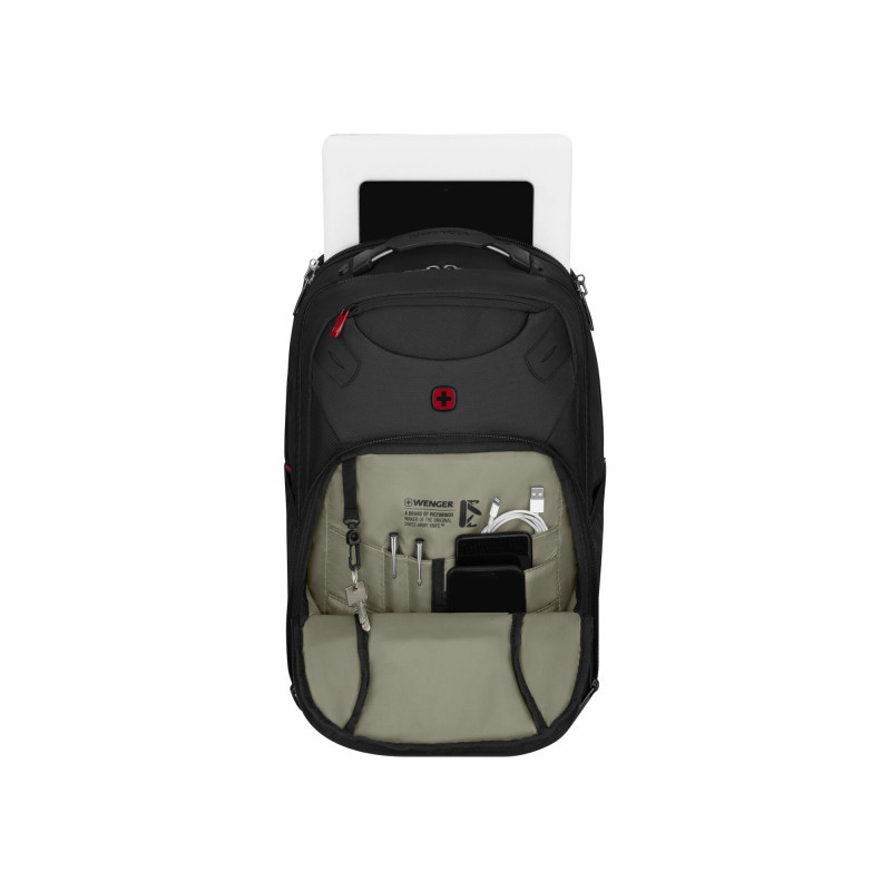 "Wenger/SwissGear Cosmic. Backpack type: Casual backpack, Product main colour: Black, Style: City. Width: 340 mm, Depth: 230 mm, Height: 490 mm. Material: Polyester, Polyvinyl chloride (PVC), Recycled polyethylene terephthalate (rPET), Material details: 82% Recycled Polyester, 15%Polyester, 3% PVC, Total amount of recycled materials used for making: 82%"\n"17'' Laptop Backpack with Tablet Pocket