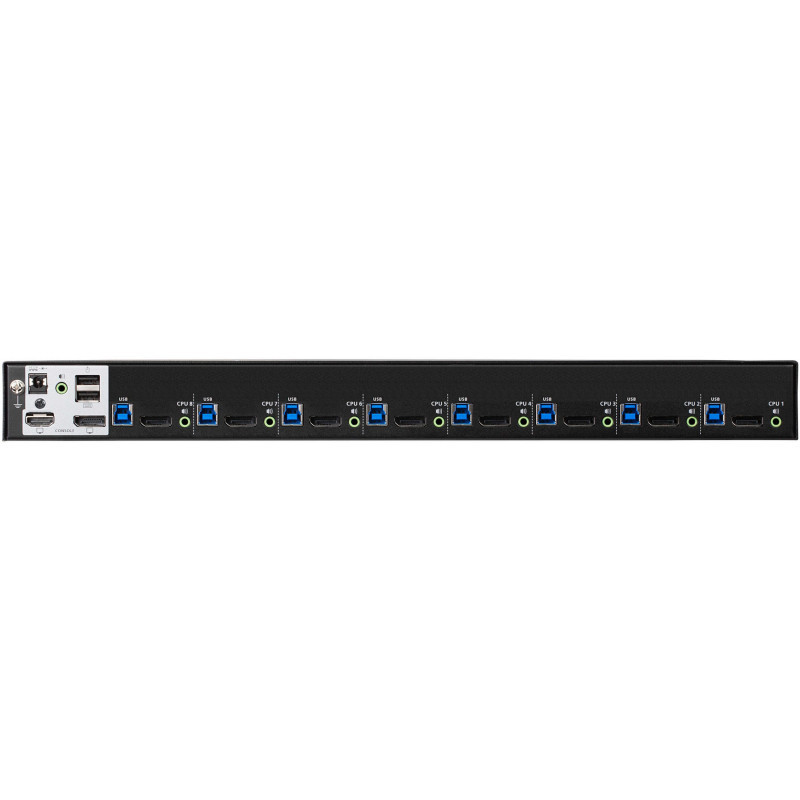 "ATEN CS19208. Keyboard port type: USB, Mouse port type: USB, Video port type: DisplayPort. HD type: 4K Ultra HD, Maximum resolution: 4096 x 2160 pixels, Video bandwidth: 60 Hz. Product colour: Black, Housing material: Metal. Power consumption (typical): 18.44 W. Width: 214.3 mm, Depth: 432.4 mm, Height: 44 mm"\n"The ATEN CS19208 8-Port USB 3.0 4K DisplayPort KVM Switch can effectively access and control up to 8 DisplayPort computers from a single USB keyboard, USB mouse, and monitor console. With its dual interface console, users can choose between DisplayPort/HDMI video output supporting high video quality up to 4K DCI (4096 x 2160 @ 60Hz), presenting crystal-clear visuals.