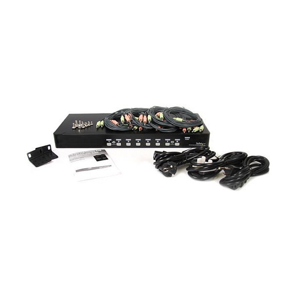 "StarTech.com 8 Port Rackmount USB VGA KVM Switch w/ Audio (Audio Cables Included). Keyboard port type: USB, Mouse port type: USB, Video port type: VGA. Maximum resolution: 1920 x 1440 pixels, Maximum analog resolution: 1920 x 1440 pixels, Number of users: 1 user(s). Product colour: Black, Rack capacity: 1U, Housing material: Steel. Input voltage: 110-240 V, Input current: 1.8 A, Output voltage: 12 V. Compliance certificates: RoHS"\n"The SV831DUSBAU 8 Port Rack Mount USB VGA KVM Switch (with Audio Cables Included) allows you to control up to 8 USB computers using a single keyboard, mouse and monitor, and features Audio and Microphone ports to switch between audio signals as well as PC ports.