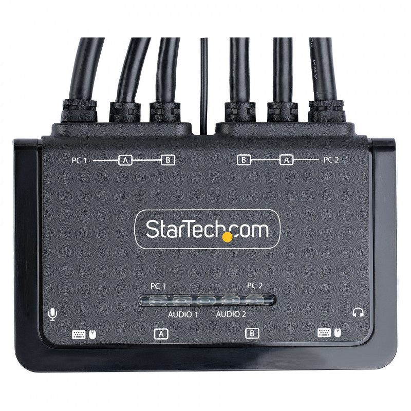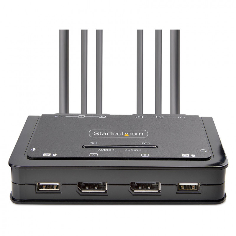 This Dual-Monitor KVM Switch enables users to switch between two USB-A and DisplayPort enabled desktops, sharing dual-4K 60Hz DisplayPort monitors, a keyboard and mouse, and audio input/output devices.