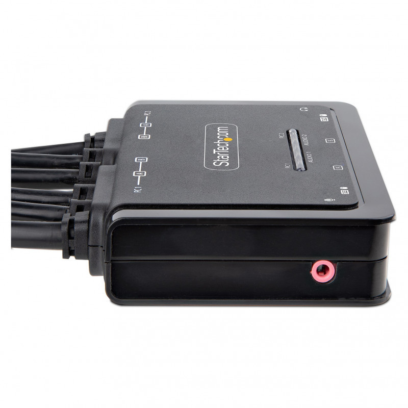 "StarTech.com 2-Port Dual-Monitor DisplayPort Cable KVM Switch, 4K 60Hz, Compact KVM with 5ft/1.5m USB-A/DisplayPort/Audio Integrated Cables, Bus Powered - Remote Push Button/Hotkey Switching. Keyboard port type: USB, Mouse port type: USB, Video port type: DisplayPort. HD type: 4K Ultra HD, Maximum resolution: 4096 x 2160 pixels, Video bandwidth: 60 Hz. Product colour: Black, Housing material: Acrylonitrile butadiene styrene (ABS), Cable length: 1.5 m. Power source: USB. Windows operating systems supported: Windows 10, Windows 10 Education, Windows 10 Education x64, Windows 10 Enterprise, Windows 10..., Mac operating systems supported: Mac OS X 10.12 Sierra, Mac OS X 10.13 High Sierra, Mac OS X 10.14 Mojave, Mac OS X 10.15 Catalina,..., Other operating systems supported: ChromeOS"\n"Share a mouse, keyboard, and dual 4K 60Hz DisplayPort displays between two DisplayPort enabled computers, using this KVM Switch with built-in cables