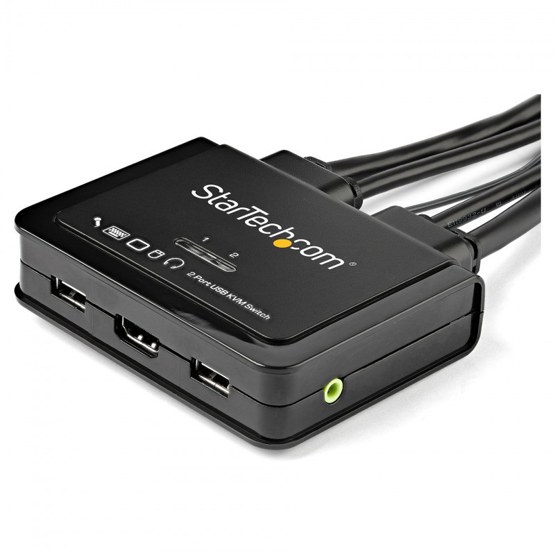 "StarTech.com 2 Port HDMI KVM Switch - 4K 60Hz - Compact Dual Port UHD/Ultra HD USB Desktop KVM Switch w/Integrated 4ft Cables & Audio - Bus Powered & Remote Switching - MacBook ThinkPad. Keyboard port type: USB, Mouse port type: USB, Video port type: HDMI. HD type: 4K Ultra HD, Maximum resolution: 3840 x 2160 pixels, Data transfer rate (max): 0.48 Gbit/s. Product colour: Black, Mean time between failures (MTBF): 1012884 h, Certification: CE, FCC, REACH. Windows operating systems supported: Windows 10, Windows 10 Education, Windows 10 Education x64, Windows 10 Enterprise, Windows 10..., Mac operating systems supported: Mac OS X 10.11 El Capitan, Mac OS X 10.12 Sierra, Mac OS X 10.6 Snow Leopard, Mac OS X 10.7 Lion,..., Server operating systems supported: Windows Server 2003, Windows Server 2008 R2, Windows Server 2012, Windows Server 2016, Windows.... Compliance certificates: RoHS"\n"KVM Switch with Audio | 3.5mm Audio Input & Output | HDMI | USB-Powered