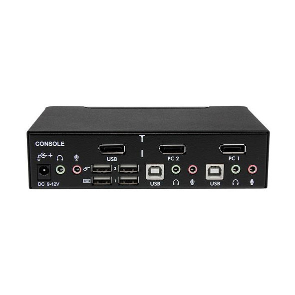 "StarTech.com 2 Port Professional USB DisplayPort KVM Switch with Audio. Keyboard port type: USB, Mouse port type: USB, Video port type: DisplayPort. HD type: 4K Ultra HD, Maximum resolution: 3840 x 2400 pixels. Product colour: Black, Housing material: Steel, Certification: CE, UL, FCC, REACH. Input voltage: 110 - 240 V, Input current: 0.8 A, Output voltage: 12 V. Compliance certificates: RoHS"\n"Control two computers from a single console, with high-resolution DisplayPort video, USB keyboard, mouse, and audio