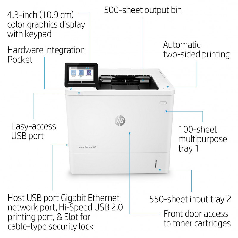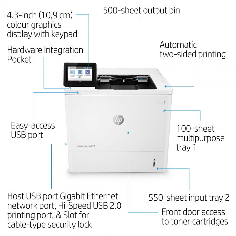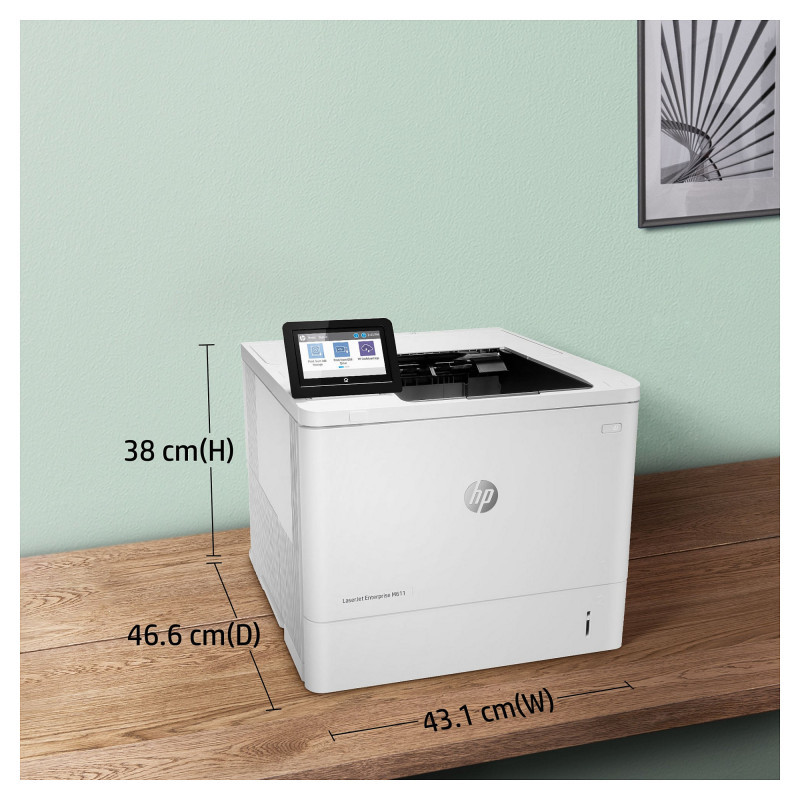 "HP LaserJet Enterprise M611dn. Print technology: Laser. Number of print cartridges: 1, Maximum duty cycle: 275000 pages per month. Maximum resolution: 1200 x 1200 DPI. Maximum ISO A-series paper size: A4. Print speed (black, normal quality, A4/US Letter): 61 ppm, Duplex printing. Display: CGD. Network ready, Wi-Fi. Product colour: White"\n" This HP LaserJet Printer with JetIntelligence combines exceptional performance and energy efficiency with professional-quality documents right when you need them – all while protecting your network from attacks with the industry’s deepest security.[1]