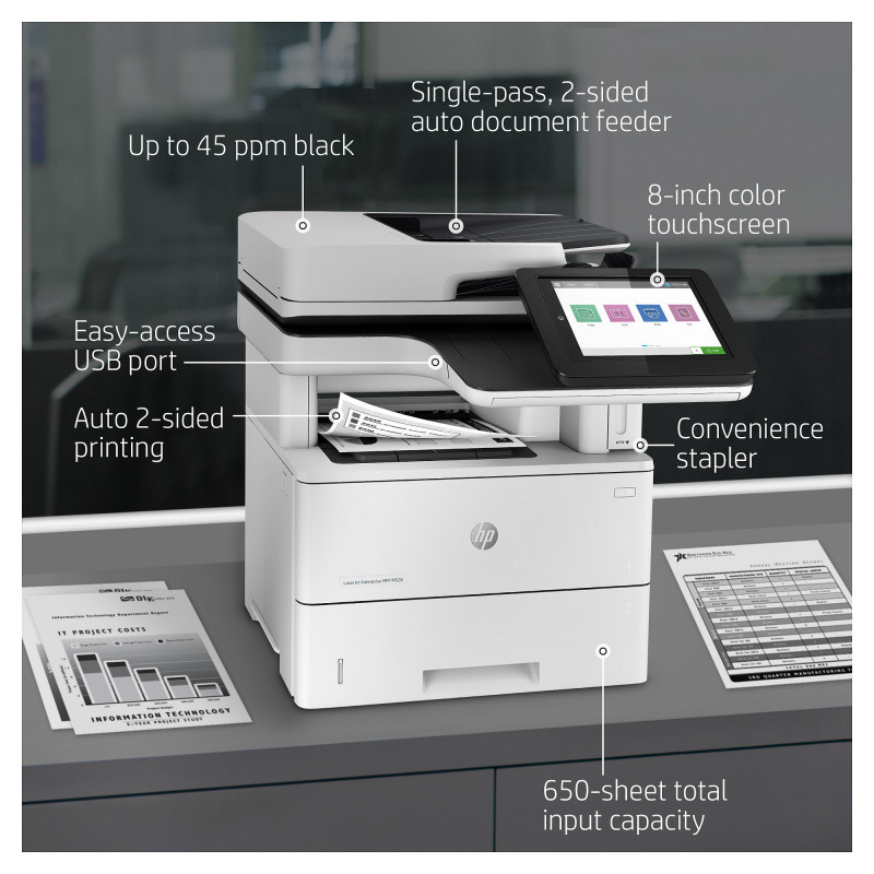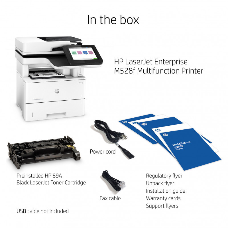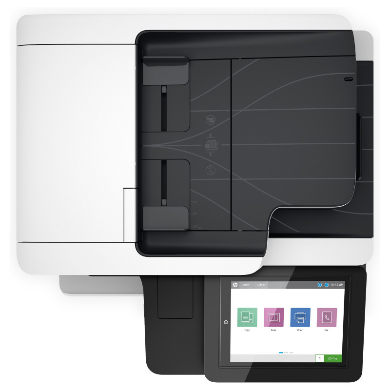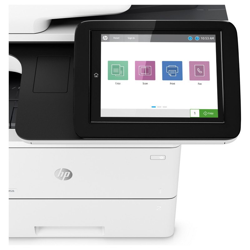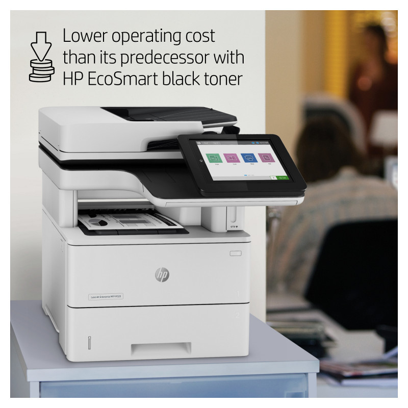"HP LaserJet Enterprise MFP M528f. Print technology: Laser, Printing: Mono printing, Maximum resolution: 1200 x 1200 DPI. Copying: Mono copying, Maximum copy resolution: 600 x 600 DPI. Scanning: Colour scanning, Optical scanning resolution: 600 x 600 DPI. Faxing: Mono faxing. Duplex functions: Print, Copy. Maximum ISO A-series paper size: A4. Wi-Fi. Direct printing. Product colour: Black, White"\n" Choose an HP LaserJet Enterprise MFP designed to handle business solutions securely and efficiently, and helps conserve energy with HP EcoSmart toner black. Keep up with the demands of growing business with a printer you can rely on.[1]