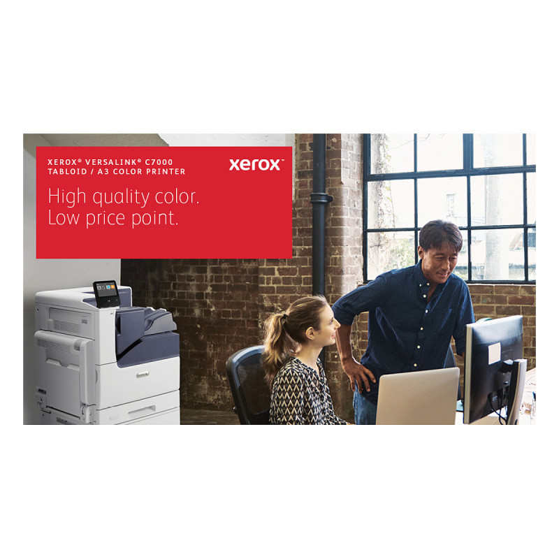 "Xerox VersaLink C7000 A3 35/35 ppm Duplex Printer Adobe PS3 PCL5e/6 2 Trays Total 620 sheets. Print technology: Laser, Colour. Number of print cartridges: 4, Maximum duty cycle: 153000 pages per month. Maximum resolution: 1200 x 2400 DPI. Maximum ISO A-series paper size: A3. Print speed (black, normal quality, A4/US Letter): 35 ppm, Duplex printing. Display: LCD. Network ready. Product colour: White"\n"When you need your work to stand out from the rest, count on the VersaLink C7000 Colour Printer - featuring Xerox® ConnectKey® Technology. Ready for the way you want to work, the C7000 is mobile-ready, app-enabled and ready to customise. Meet your challenges head-on with the VersaLink C7000 - your modern workplace assistant."