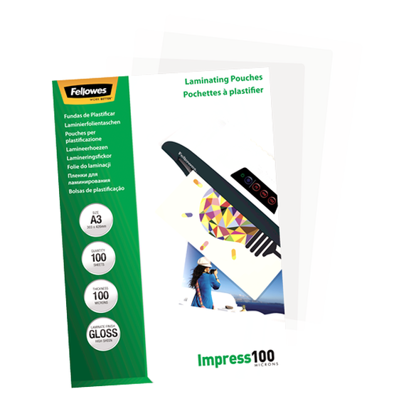 Fellowes | Laminating Pouch | A3 | Glossy | Thickness: 100 micron, Qty Per Pack: 100 pcs; Ideal for notices, craft materials, signage and frequently handled documents; Compatible with all laminator brands