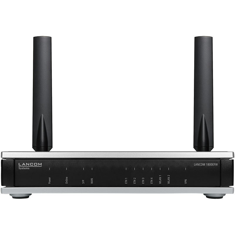 "LANCOM 1800EFW (EU). Product colour: Black, Silver, Cable lock slot type: Kensington, Number of fans: 1 fan(s). Antenna type: External, Antenna connector type: RP-SMA, Antenna gain level (max): 3 dBi. Supported network protocols: Ethernet over GRE-Tunnel (EoGRE), L2TPv3, ARP-Lookup, LLDP, DHCP option 82,..., Routing protocols: BGP4, LISP, OSPFv2, RIP-2, VRRP. Ethernet LAN data rates: 10,100,1000 Mbit/s, Networking standards: IEEE 802.11d, IEEE 802.11h, IEEE 802.11i, IEEE 802.11r, IEEE 802.11v, IEEE 802.1Q, IEEE 802.1x,..., Wi-Fi band: Dual-band (2.4 GHz / 5 GHz). Service Set Identifier (SSID) features: Multiple SSIDs, Security algorithms: 3DES, 802.1x RADIUS, 1024-bit RSA, 4096-bit RSA, AES-CCMP, AES-GCMP, EAP-FAST, EAP-GTC, EAP-MD5,..., Authentication method: PAP, CHAP, MS-CHAP, MS-CHAPv2"\n"Site networking with fiber optics, Ethernet & Wi-Fi 6