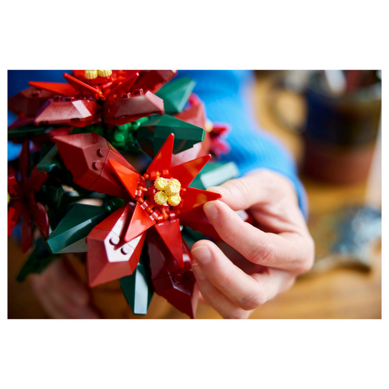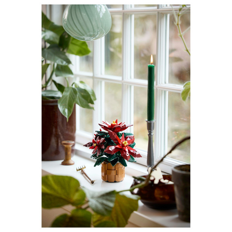 Posable LEGO® plant – This LEGO interpretation of the seasonal favourite is posable and features green leaves and 5 star-shaped clusters of red leaves (bracts) with yellow cyathia at the centre