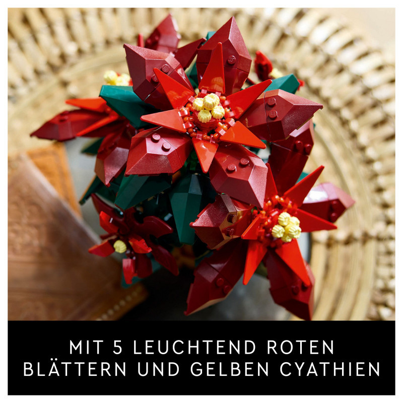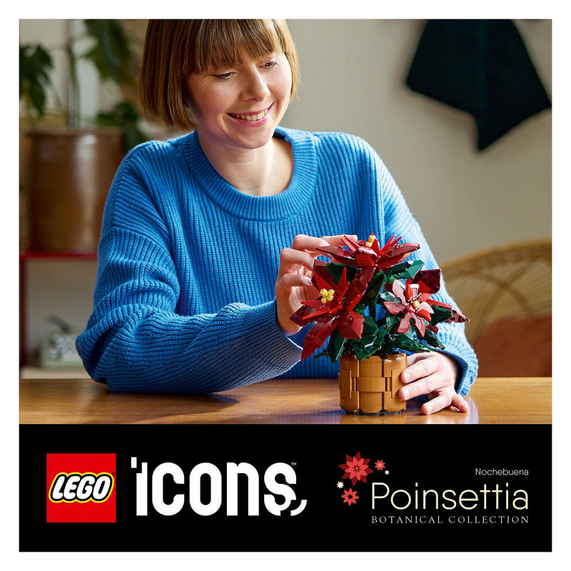 This posable LEGO plant replica depicts a ‘Grande Italia’ poinsettia nestled in a woven-basket flowerpot and features green leaves and 5 clusters of vibrant red leaves (bracts) with yellow cyathia at the centre. Easy to assemble, it delivers a rewarding building experience and makes an elegant display for the home and office.