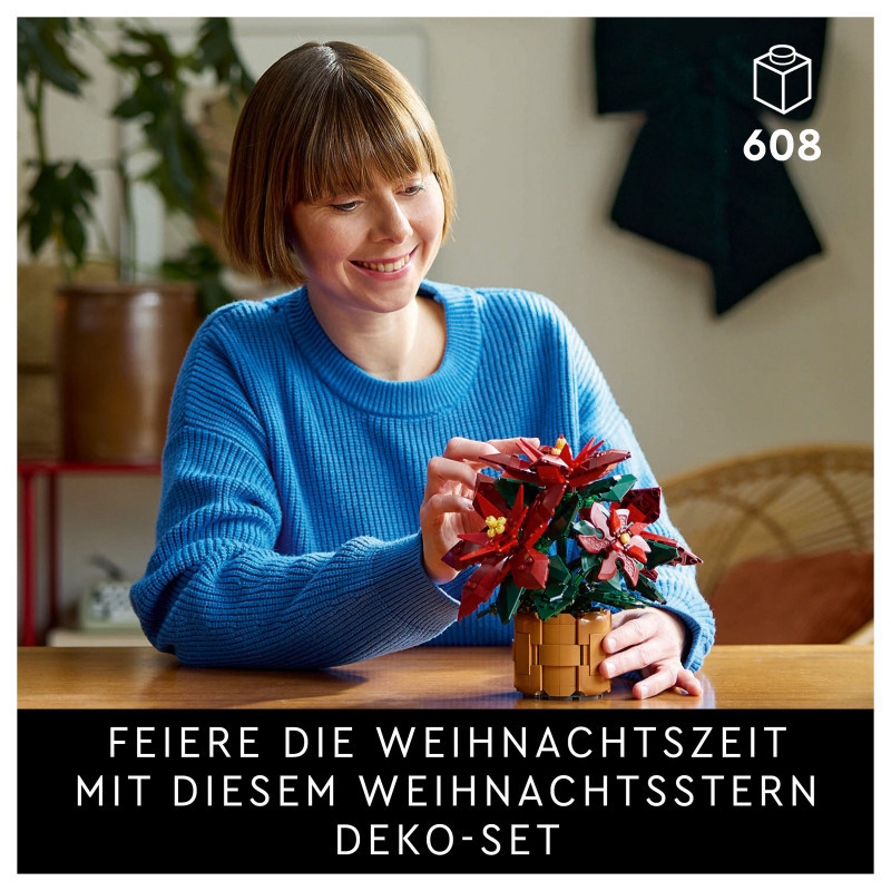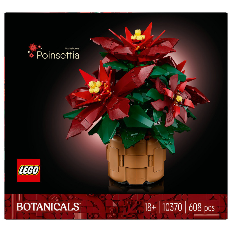 "LEGO Botanicals Poinsettia. Product type: Building set, Recommended age (min): 18 yr(s), Material: Plastic, Number of pieces: 608 pc(s). Package weight: 640 g"\n"Create an elegant, zero-maintenance floral display with this LEGO® Botanicals Poinsettia (10370) plant decor building set for adults. Indulge in a mindful building project or treat a loved one to this timeless floral display – a perfect gift idea for any occasion.