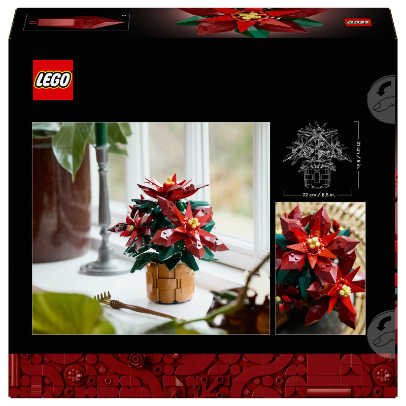 Dimensions –The poinsettia plant, including the flowerpot, in this 608-piece building set measures over 21 cm (8 in.) high, 22 cm (8.5 in.) wide and 17 cm (6.5 in.) deep"