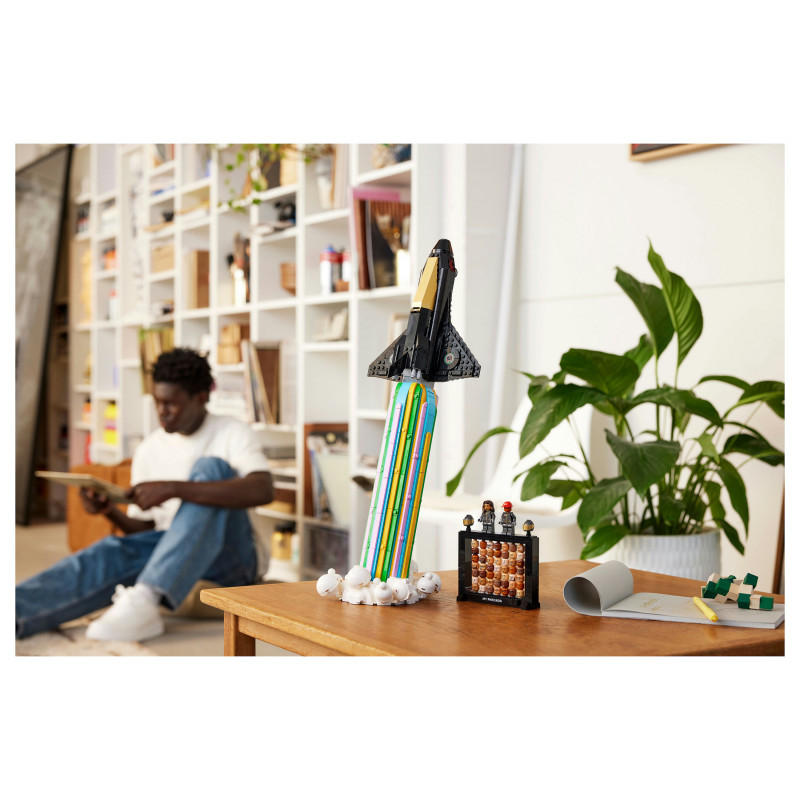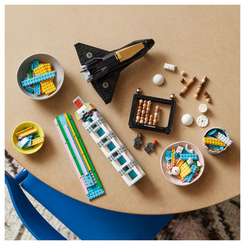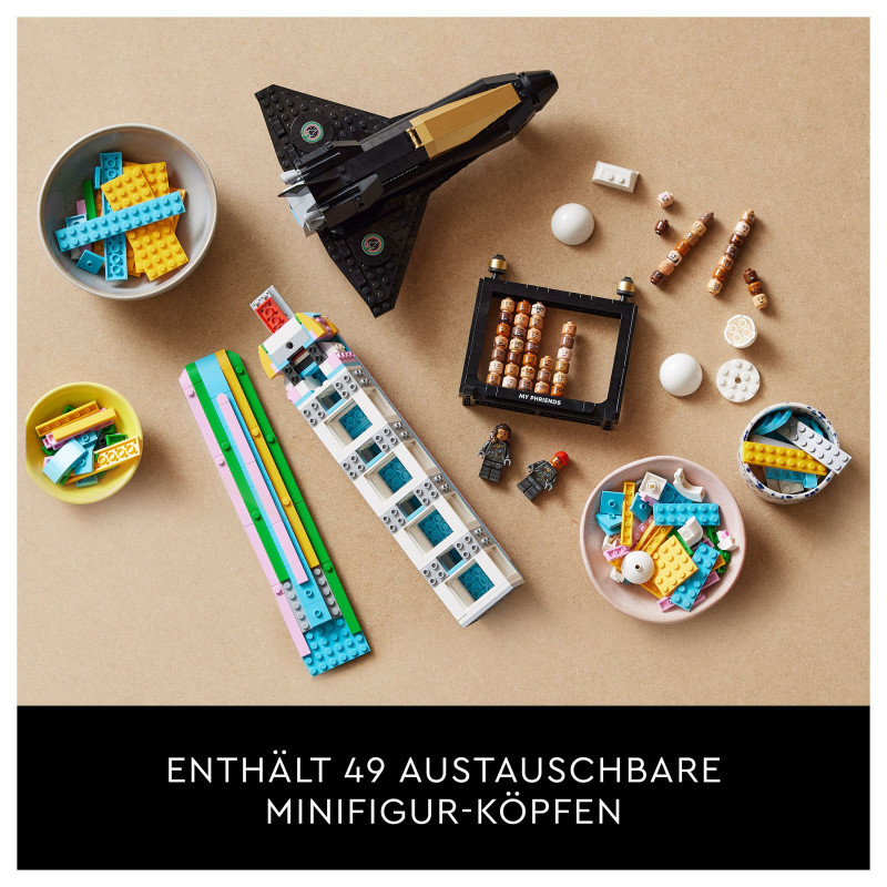 What’s in the box – All you need to build a model space shuttle and colourful jet-stream display stand, plus Pharrell Williams and Helen Williams minifigures and 49 interchangeable character heads