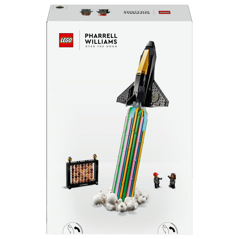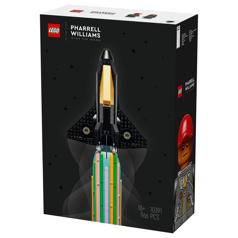 "LEGO Over the Moon with Pharrell Williams. Product type: Building set, Recommended age (min): 18 yr(s), Material: Plastic, Number of pieces: 966 pc(s). Package weight: 1.43 kg"\n"Embark on a fantastic journey with the LEGO® Icons Over the Moon with Pharrell Williams (10391) building project for adults. As a child, Pharrell’s creative optimism and his surroundings at Atlantis Apartments fuelled his curiosity and provided the launchpad that helped him build the future he wanted for himself, and others like him. The inspiring display model depicts a space shuttle heading for the stars, propelled by a colourful jet stream. This set also includes Pharrell Williams and Helen Williams astronaut minifigures, plus 49 interchangeable character heads.