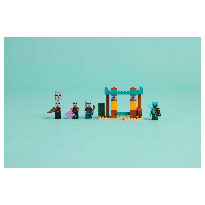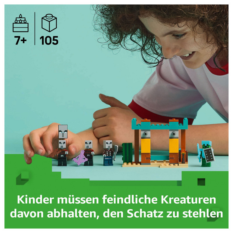 "LEGO Minecraft The Illager Desert Patrol. Product type: Building set, Recommended age (min): 7 yr(s), Material: Plastic, Number of pieces: 105 pc(s). Package weight: 166 g"\n"There’s big fun for Minecraft® players in this small LEGO® set for kids aged 7 and over. With 4 LEGO Minecraft figures, fun features and authentic accessories, The Illager Desert Patrol (21267) is a mini toy with mega Minecraft action.