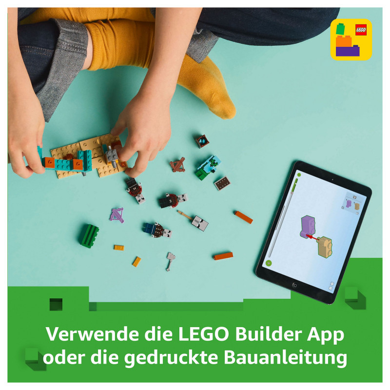Set in a Minecraft desert outpost, kids role-play being a Cactus Knight, with its diamond armour and shield and sword. When 3 illager figures arrive to steal treasure, kids must defend the outpost. The set includes missiles that kids can launch with a flick of their finger, a variety of weapons and a barrel that holds the treasure. For extra digital fun, the LEGO Builder app lets kids zoom in and rotate models in 3D using their device.