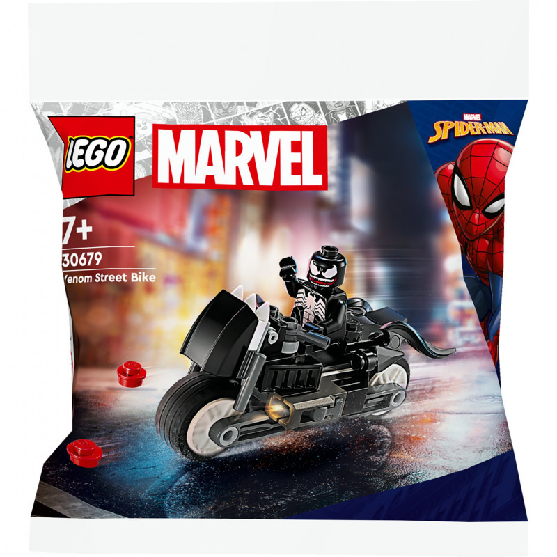 "LEGO Venom Street Bike. Product type: Building set, Recommended age (min): 7 yr(s), Material: Plastic, Number of pieces: 53 pc(s). Package weight: 40 g"\n"A buildable motorcycle toy measuring over 10 cm (4 in.) long and a Venom minifigure. The powerful-looking motorcycle features rolling wheels and 2 stud shooters."