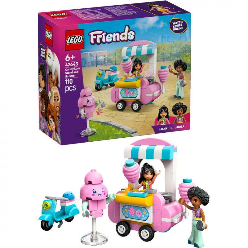 "LEGO Candyfloss Stand and Scooter. Product type: Building set, Recommended age (min): 6 yr(s), Material: Plastic, Number of pieces: 110 pc(s). Package weight: 138 g"\n"Inspire sugar-sweet pretend play for kids aged 6 and over with the LEGO® Friends Candyfloss Stand and Scooter (42643) toy. The set comes with 2 LEGO Friends minidolls and features a buildable mobile food cart, scooter, mascot and accessories.