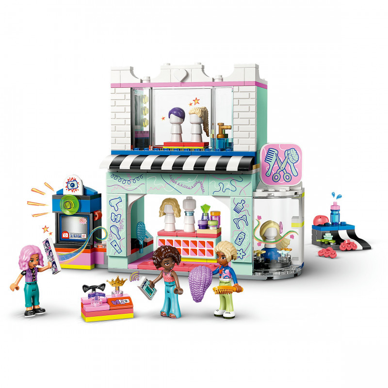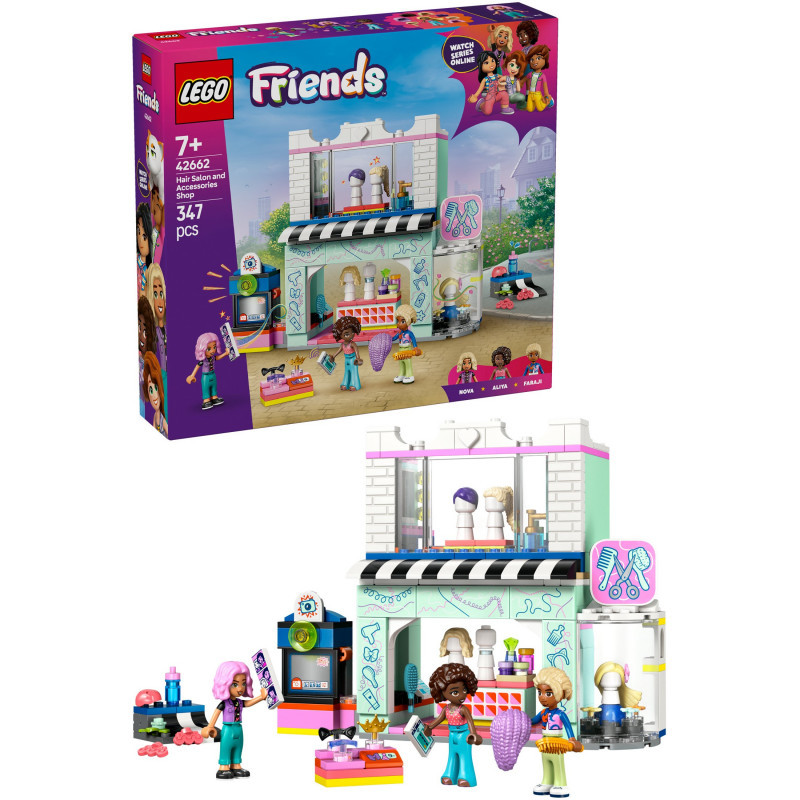 "LEGO Hair Salon and Accessories Shop. Product type: Building set, Recommended age (min): 7 yr(s), Material: Plastic, Number of pieces: 347 pc(s). Package weight: 563 g"\n"Pretend play is lots of fun for kids aged 7 and over at the LEGO® Friends Hair Salon and Accessories Shop (42662). This set for girls, boys and any accessories-loving kid features 3 LEGO Friends minidolls and lots of hair accessories for creative role play.