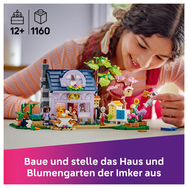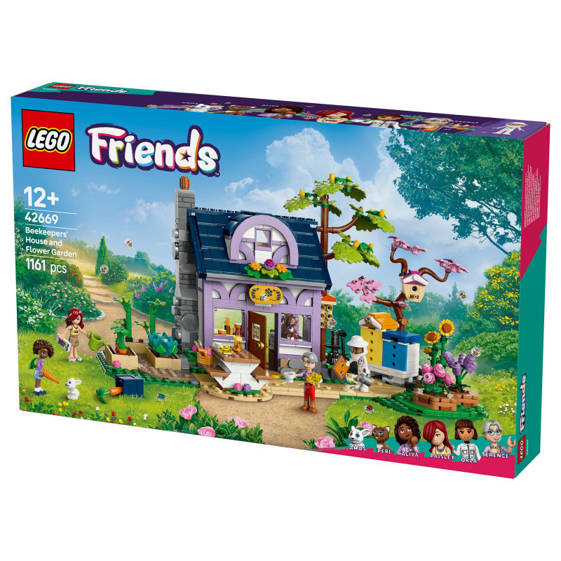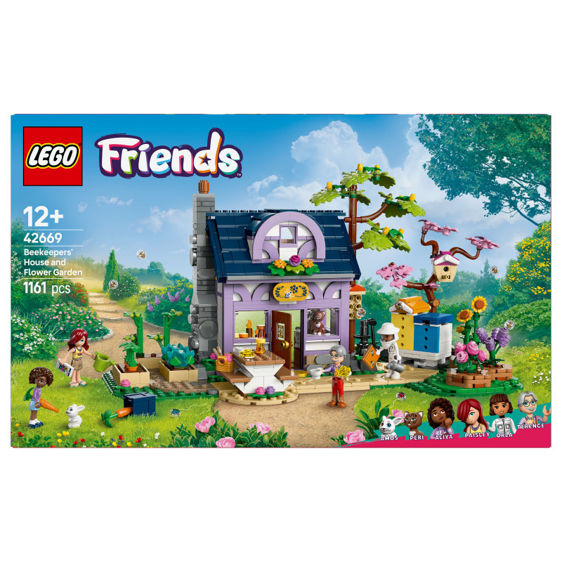 "LEGO Friends Beekeepers' House and Flower Garden. Product type: Building set, Recommended age (min): 12 yr(s), Material: Plastic, Number of pieces: 1161 pc(s). Package weight: 1.43 kg"\n"Discover a building kit packed with sunny moments for teens and kids who love creative projects. The LEGO® Friends Beekeepers’ House and Flower Garden (42669) toy makes a great gift for kids aged 12 and over. It comes with a 2-storey house and garden, plus 4 LEGO Friends characters, a cat figure and a rabbit figure.