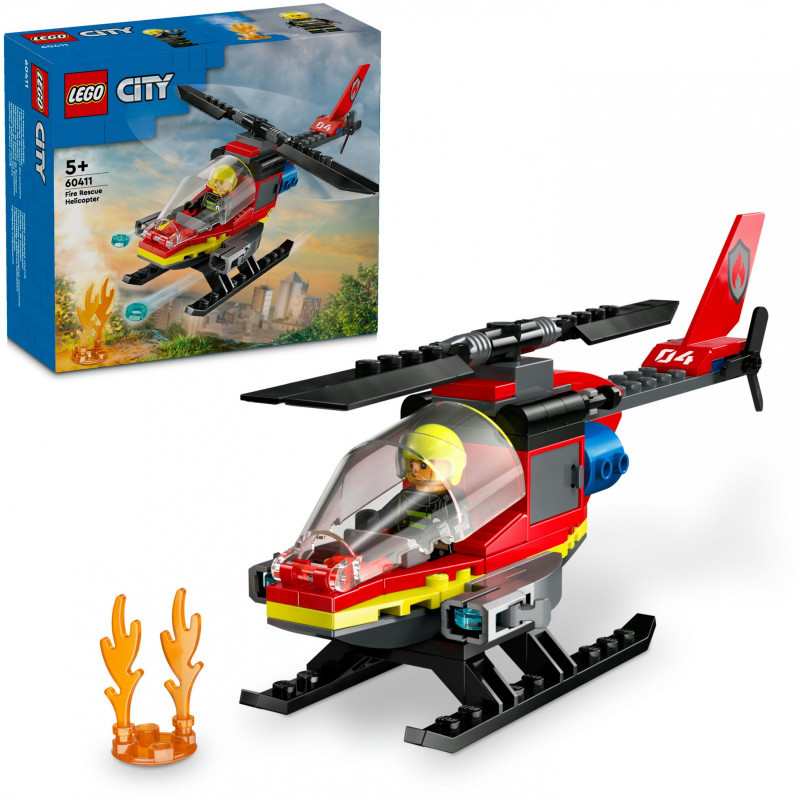 "LEGO Fire Rescue Helicopter. Product type: Building set, Recommended age (min): 5 yr(s), Material: Plastic, Number of pieces: 85 pc(s). Package weight: 159 g"\n"Send kids’ imaginations skywards with the LEGO® City Fire Rescue Helicopter toy (60411) for ages 5 and over, featuring 2 LEGO water elements launchers, spinnable rotors and a cool cockpit for the firefighter pilot minifigure. Treat your everyday hero to a world of action-packed fire rescue adventures with this fun playset.