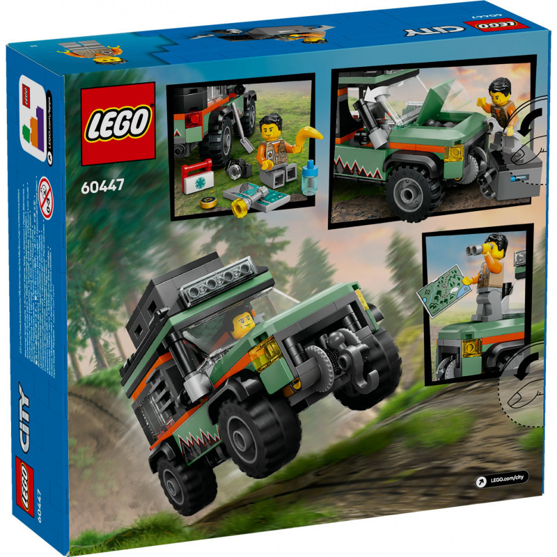 "LEGO Off-Road 4x4 Mountain Truck. Product type: Building set, Recommended age (min): 6 yr(s), Material: Plastic, Number of pieces: 221 pc(s). Package weight: 339 g"\n"Kids can head for the hills with the LEGO® City Off-Road 4x4 Mountain Truck (60447) adventure toy for ages 6 and over. This tough truck is loaded with cool features and equipment for off-road exploration, including roof storage boxes, tools, rugged tyres and a working winch for tackling steep inclines. Flip the vehicle snorkel and up pops the bonnet for engine repairs! Just add the adventurer minifigure and let the play begin.