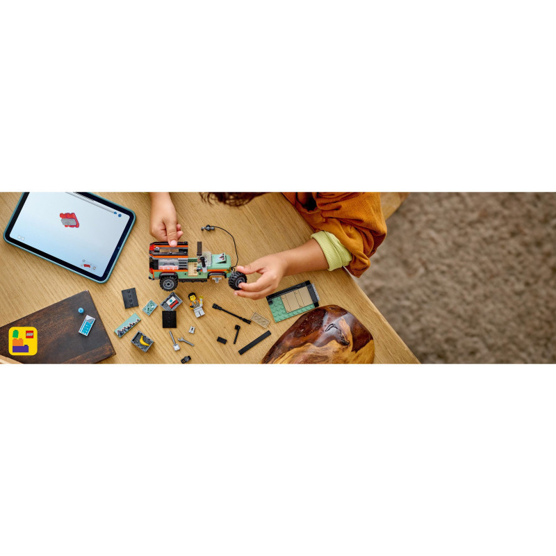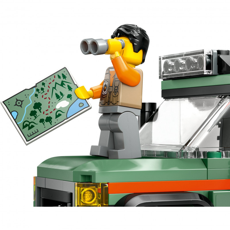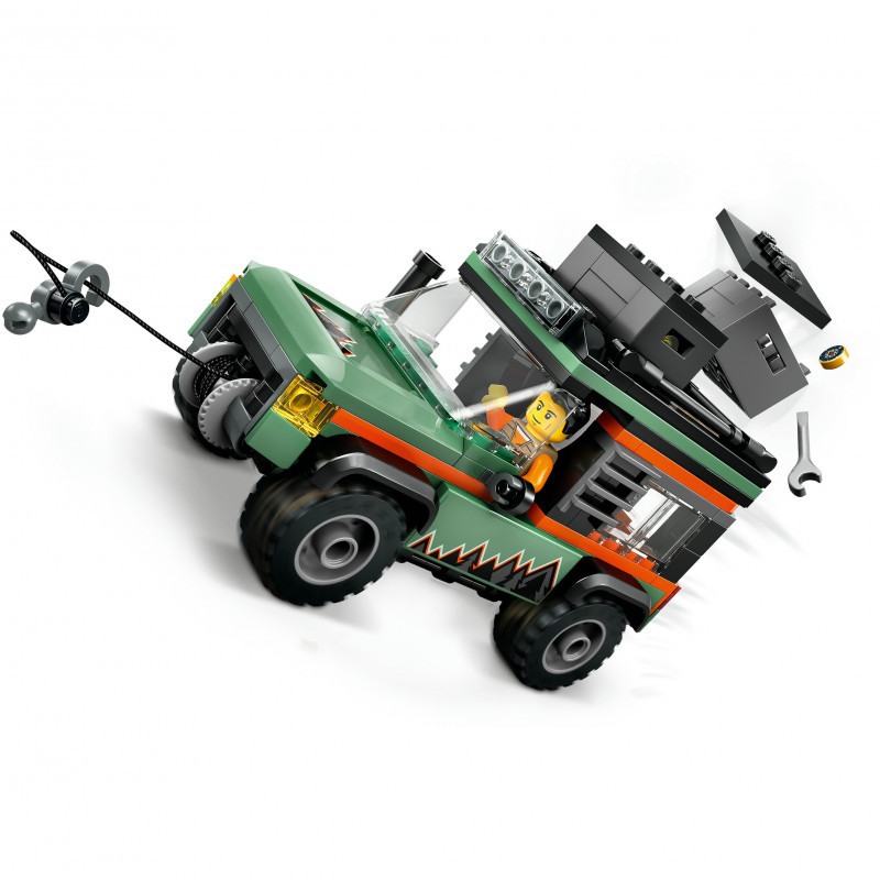 Vehicle set packed with LEGO® minifigure accessories – Includes a toy camera, water bottle, torch, map, compass, binoculars, tools and a first-aid kit for pretend play